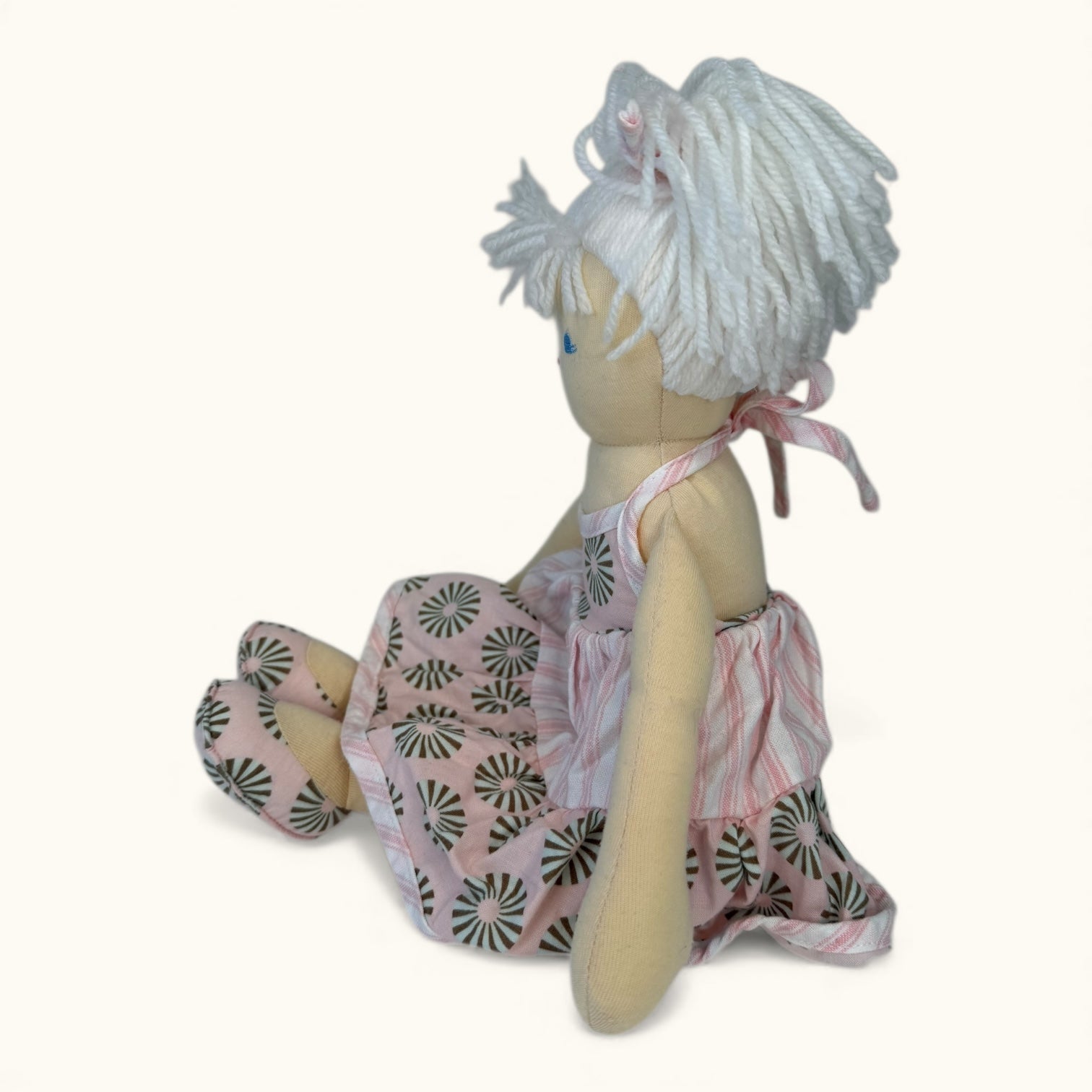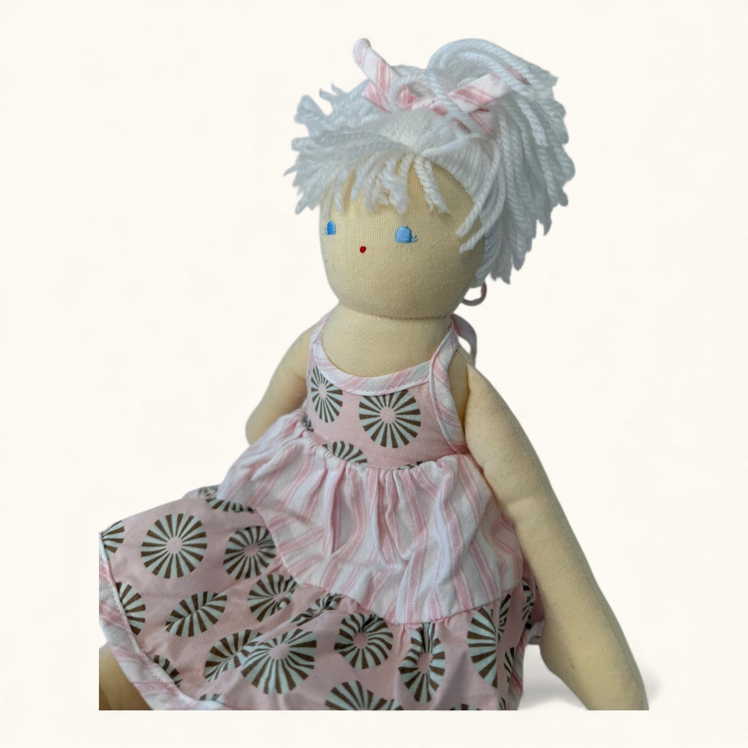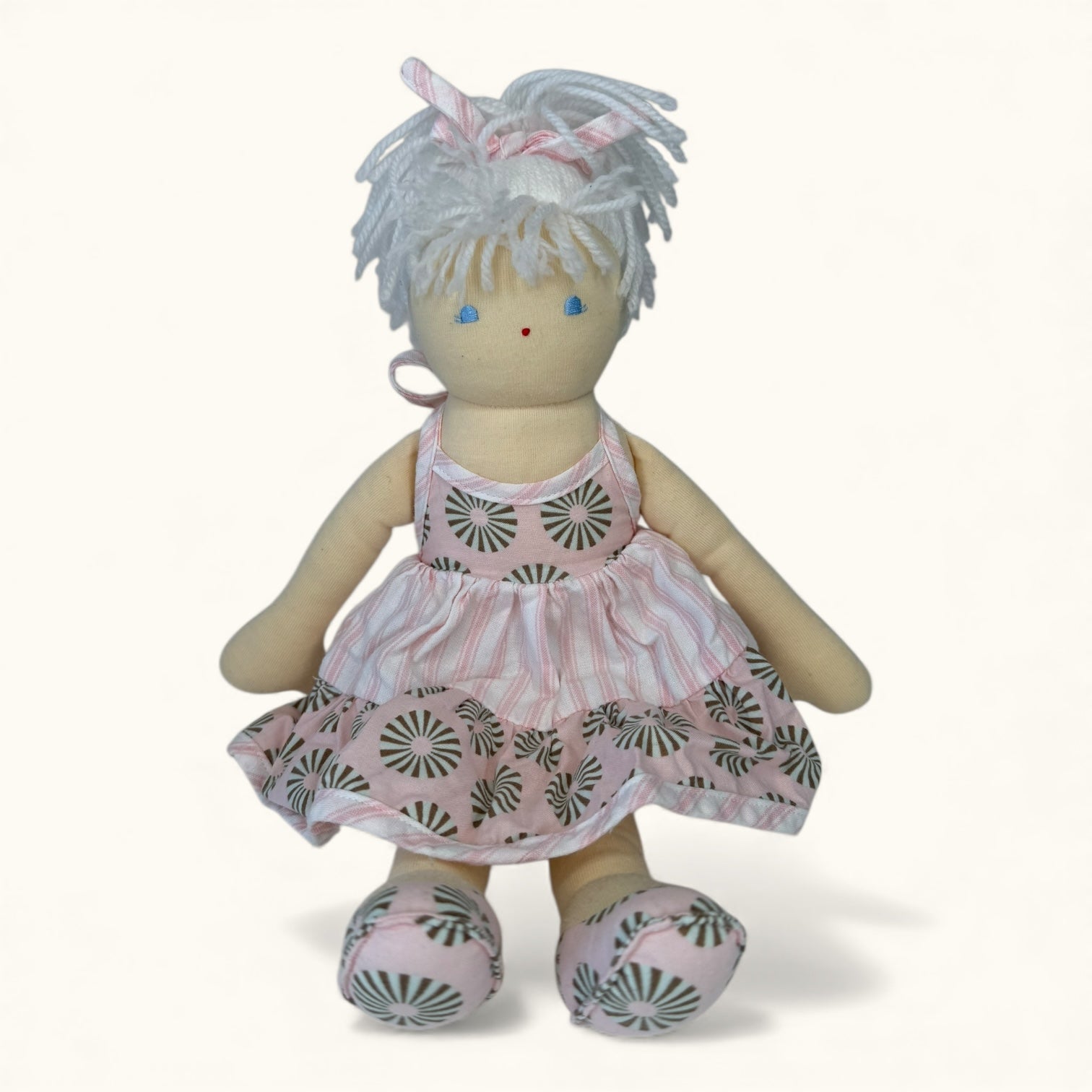 Juliet is a soft-spoken sweetheart who loves warm morning sunshine and twirling slowly in her peppermint-pink dress. She spends her days arranging pretend tea parties, choosing which imaginary cupcake flavour fits her mood. With her fluffy yarn hair always tied in a bow, she brings a calm, gentle magic to any room she enters. Juliet is the kind of dolly who listens to every secret as if it’s the most precious story in the world.