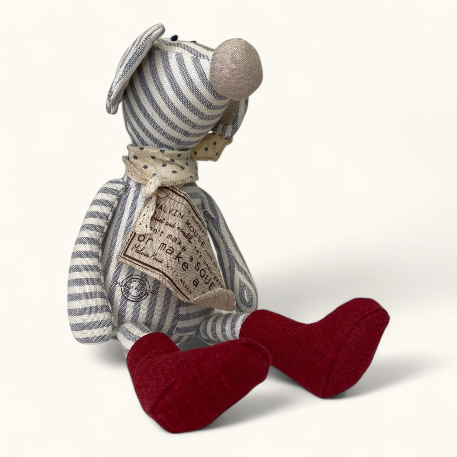 A little something to set me apart:  I’m made from soft, striped fabric with bright red feet and a stitched scarf. My quiet charm makes me stand out in the sweetest way.